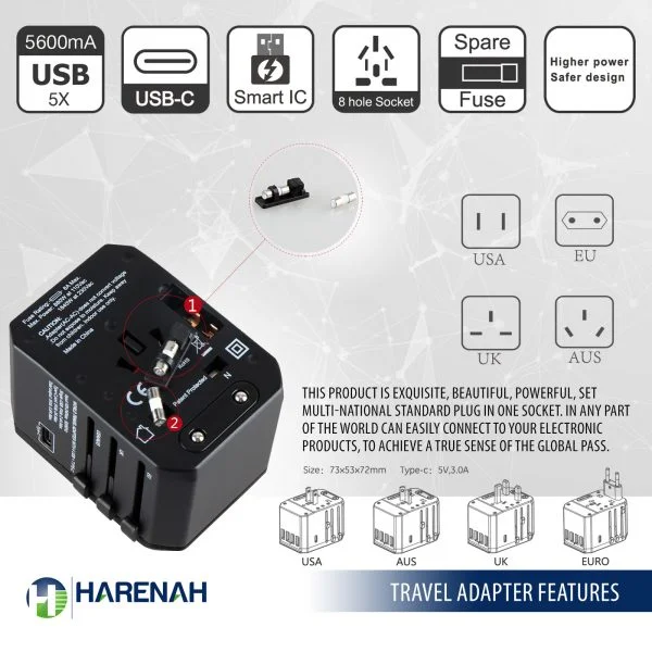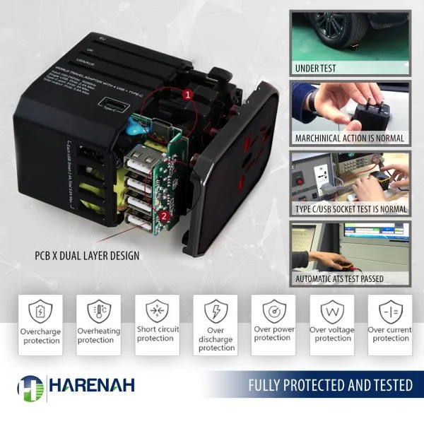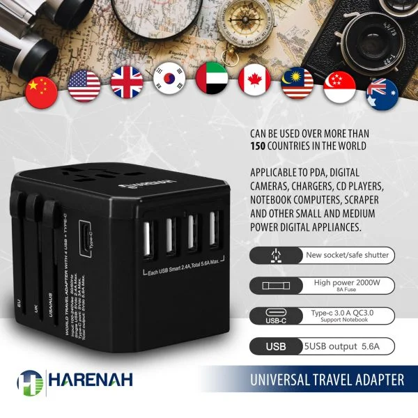 HARENAH Universal Type C USB Adapter – Compact Multifunctional Travel Adapter For US, UK, EU, AUS Plugs & 150 Countries – Powerful, Easy To Use International Socket Adapter With 4 USB Charger Ports